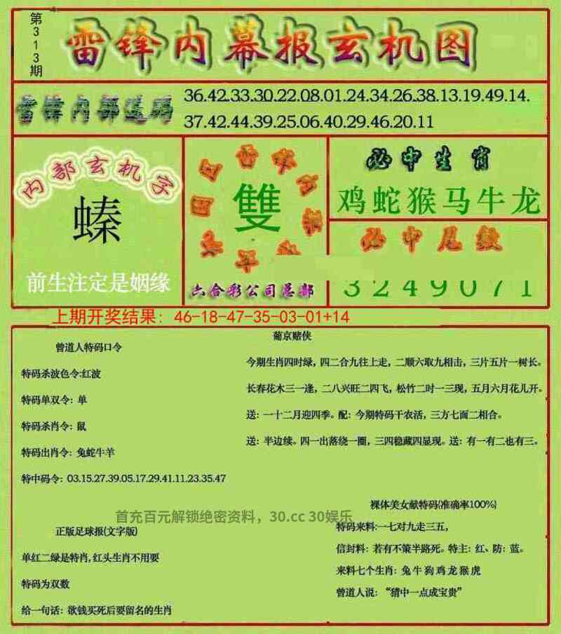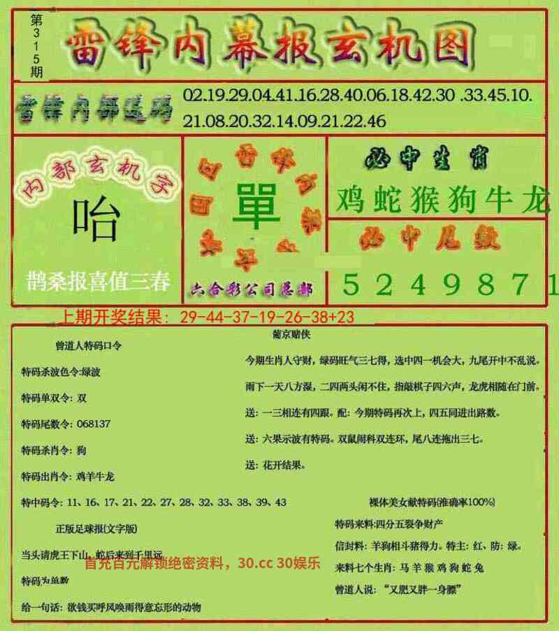 311期:男女两肖女肖+猴虎』开:蛇37准