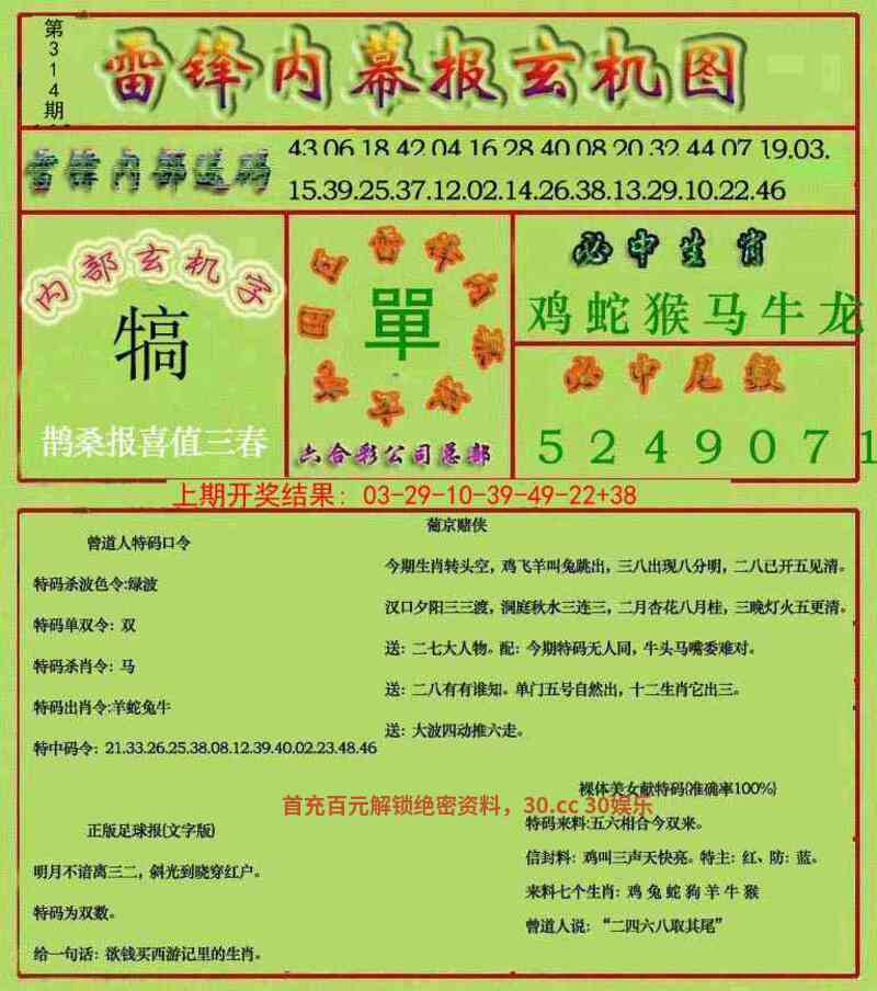 306期:男女两肖男肖+鸡蛇』开:牛17准